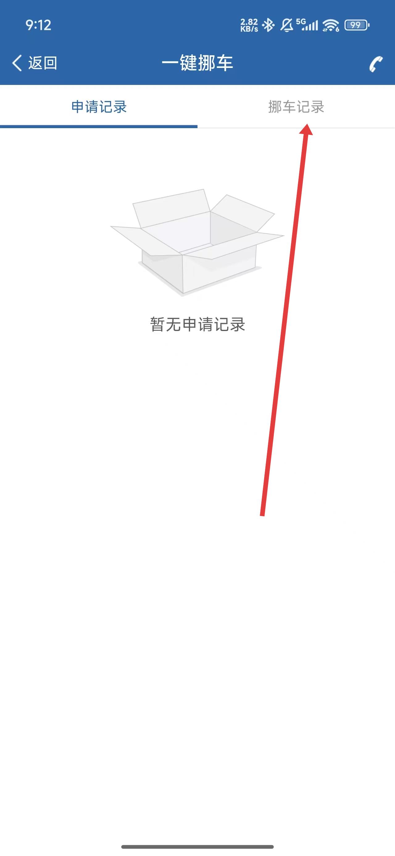 3、在跳转到申请记录页面后,可以点击右侧的挪车记录模块,进行查询。