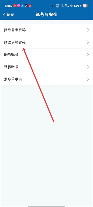 2、在账号与安全页面点击修改手势密码选项,进入验证界面。