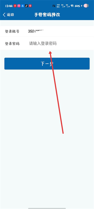 3、在验证界面输入当前登录密码,点击下一步进入手势密码绘制。