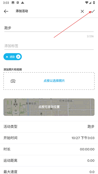 3、填写活动相关信息,然后点击页面右上角的对勾按钮。