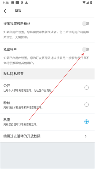 4、在隐私设置页面找到私密账户功能开关,将其开启。