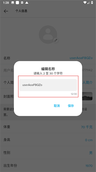 3、在个人信息界面点击名称选项,弹出编辑名称的输入弹窗。