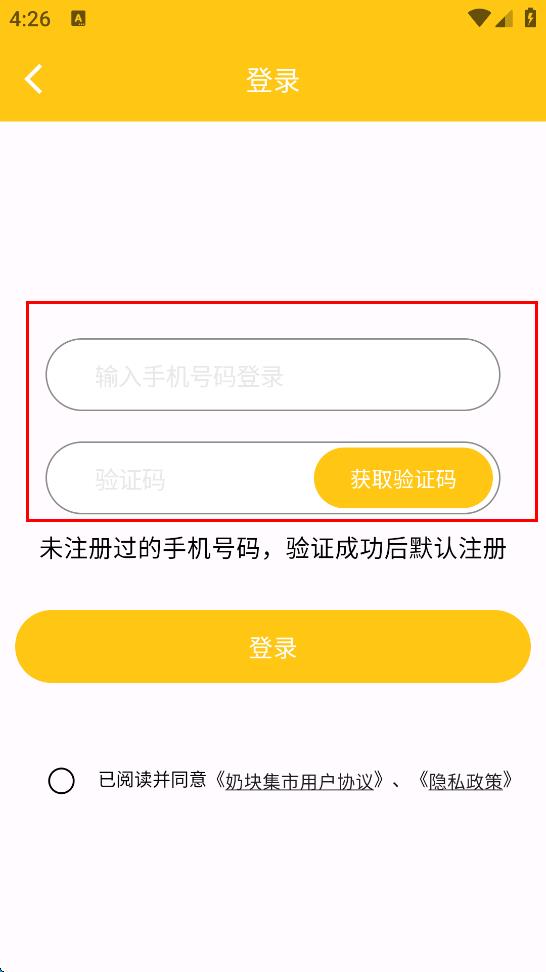4、勾选“已阅读并同意奶块集市用户协议,隐私政策,点击“登录”按钮,完成登录操作。