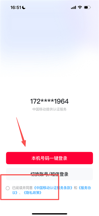 3、在登录验证页面,勾选协议后点击本机号码一键登录按钮,可完成账号登录。