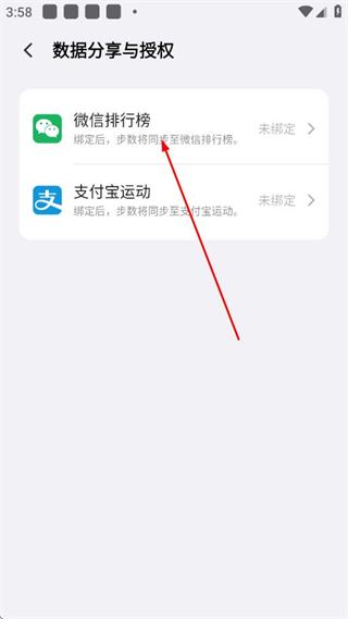 4、在数据分享与授权页面点击微信排行榜选项,完成微信的绑定操作。