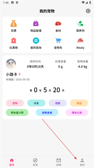 1、打开铲屎官日记应用,点击右下角我的选项。