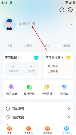 2、在个人中心页面,点击登录/注册选项,进入登录选择页面。