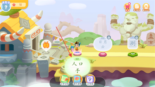 1、在贝壳识字主界面,点击001人口手课程入口,进入第1课学习页面。