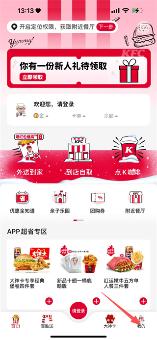 2、在肯德基APP首页,点击底部导航栏的我的,进入个人页面。