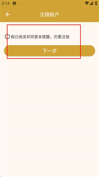 4、在注销账户页面,勾选协议后点击下一步按钮,触发确认提示弹窗。