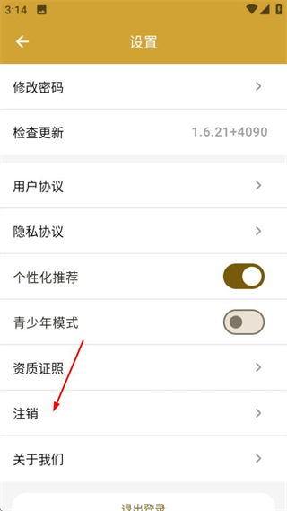 3、在设置页面,点击注销选项,进入注销账户页面。