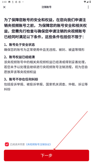 4、进入注销账号的页面内,勾选阅读并同意后点击下一步。