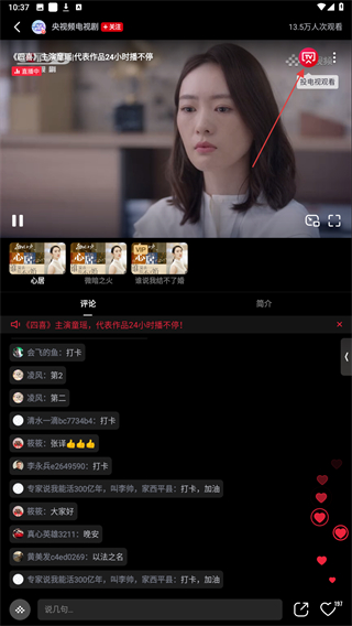 3.打开央视屏,点击下方电视区块,选择自己想要播放的视频或者直播频道,点击投屏按钮,选择刚才记住的设备名称,之后画面就可以投屏到电视上了。