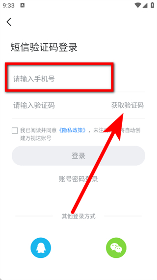 3、在登录界面,输入手机号,点击获取验证码。
