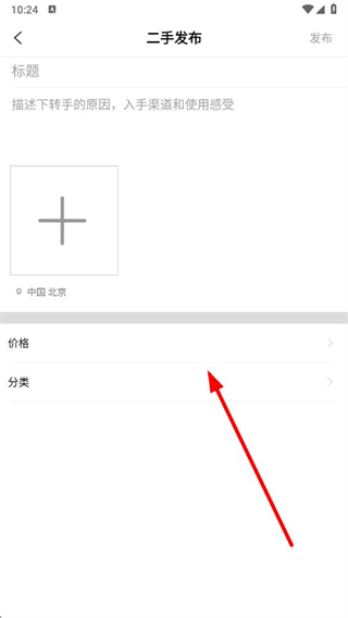 3、在二手发布界面,依次填写标题、转卖原因,添加图片,设置价格和分类,确认地区后点击发布。