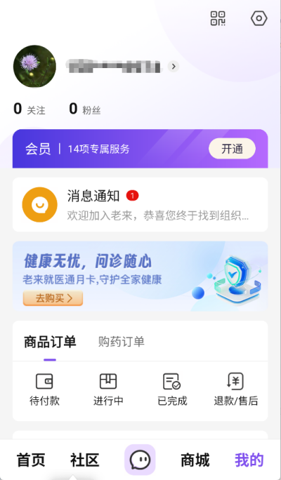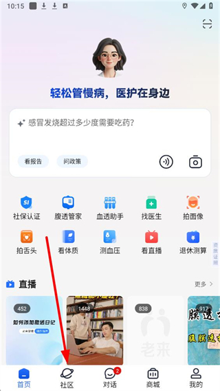1、在老来健康首页,点击底部的社区选项,进入社区页面。