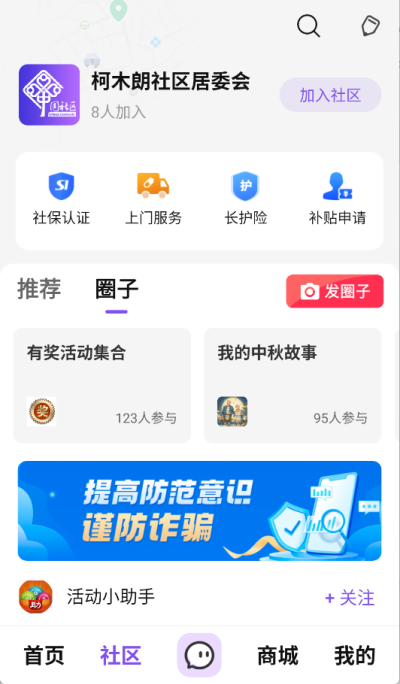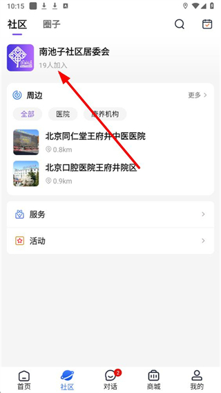 2、点击下方的社区选项,在里面拥有更多的社区服务功能可以查看,可以自己选择相应的居委会加入其中,提供更加精准的生活服务内容;