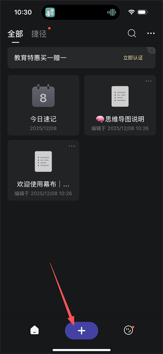 1、在幕布主界面,点击底部的加号按钮,弹出新建选项菜单。