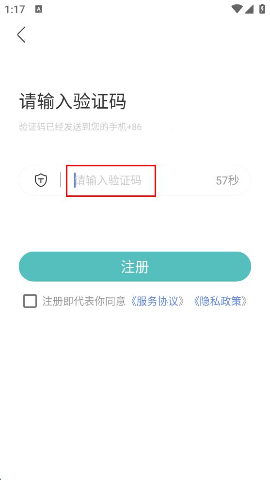4、输入好验证码后,勾选注册即代表你同意服务协议,隐私政策,最后点击注册按钮,完成注册流程。