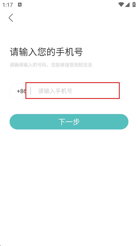 2、在手机号填写页面,输入自己的手机号,然后点击下一步,进入验证码填写页面。