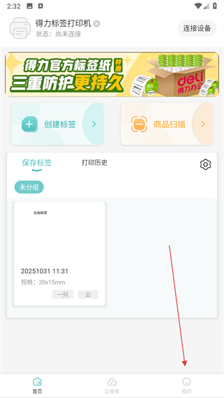 1、打开得力标签打印应用,在首页底部找到我的选项,点击进入个人中心页面。