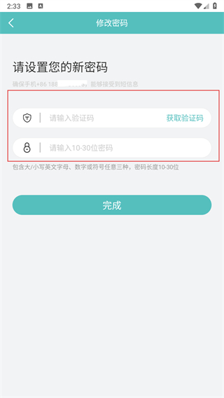 4、点击获取验证码,输入收到的验证码与符合要求的新密码,点击完成按钮。