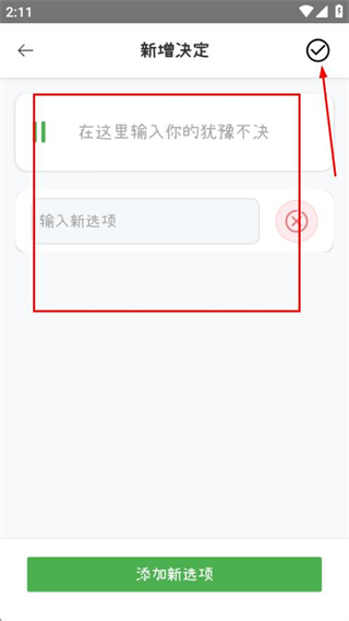 3、在新增决定页面,输入后,点击右上角的对勾按钮保存新增决定。