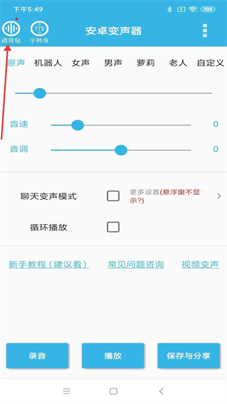 1、打开安卓变声器应用,在首页找到语音包按钮,点击该按钮进入语音包选择页面。