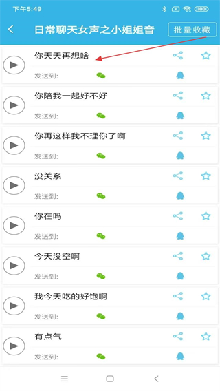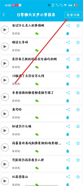 3、在语音包详情列表右上角,找到批量收藏按钮,点击该按钮进入批量选择界面。
