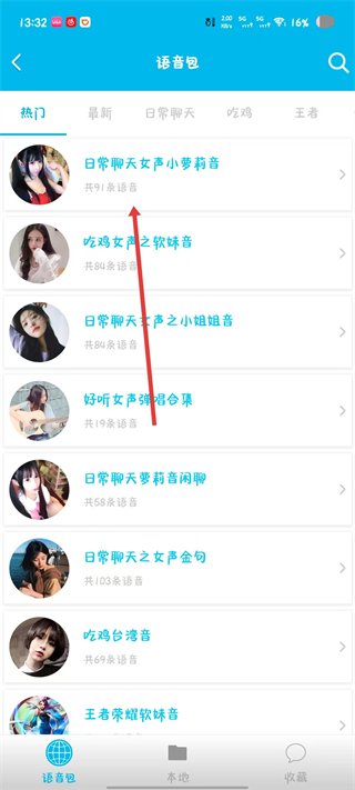 2、在语音包页面中,选择目标语音分类,点击对应分类下的语音包进入详情列表。