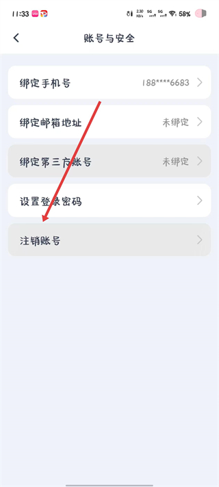3、在账号与安全页面里找到注销账号选项,点击该选项进入账号注销确认界面。