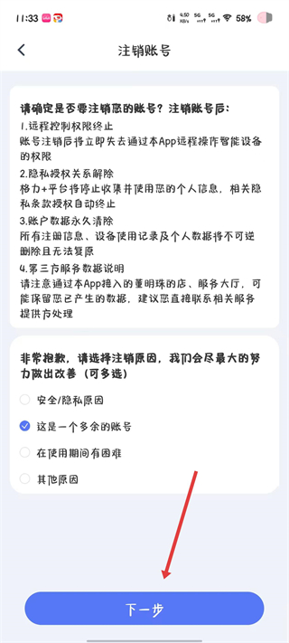 4、在注销账号界面阅读相关提示,选择注销原因后点击下一步按钮即可完成注销。