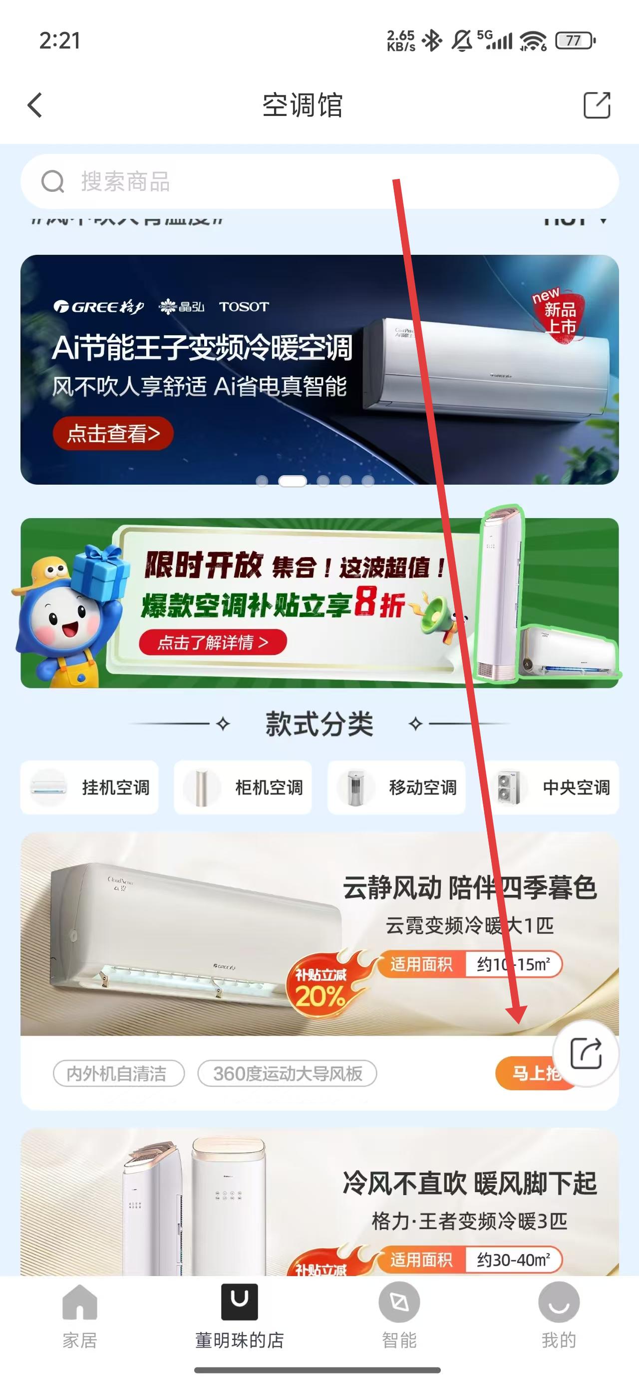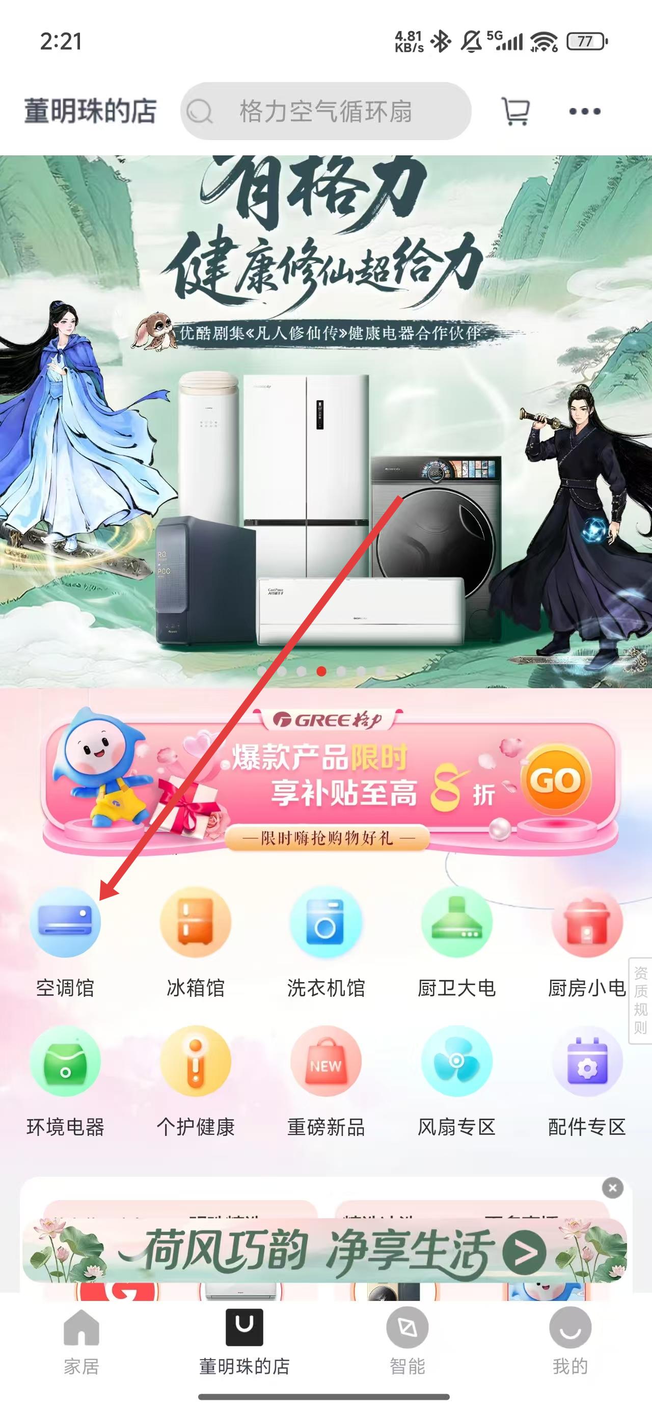 1、打格力app后,在董明珠的店页面点击空调馆,进入查看空调。