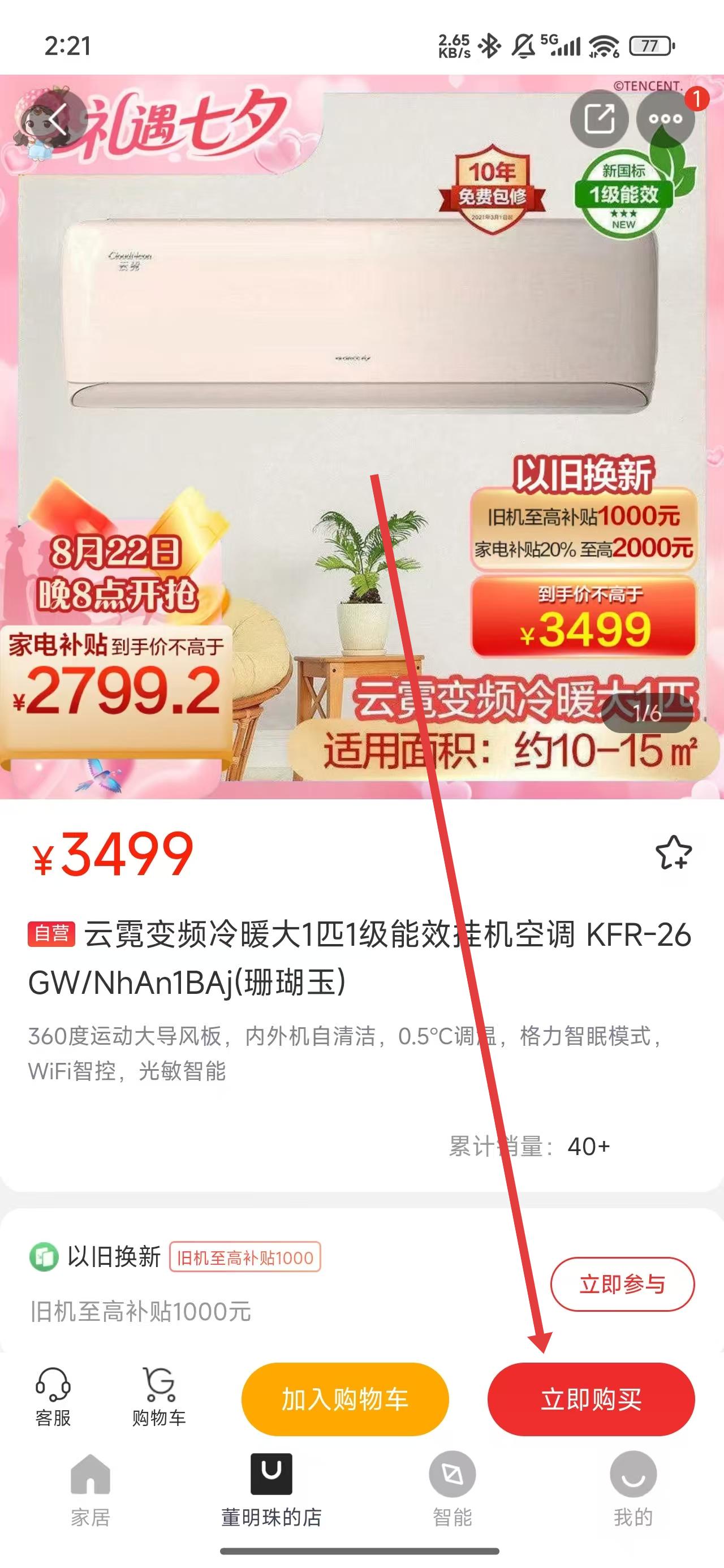 3、在进入到该空调购买页面时,点击底下的立即购买按钮,购买该空调。