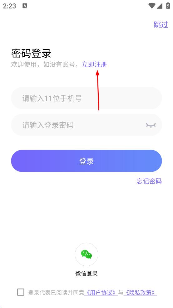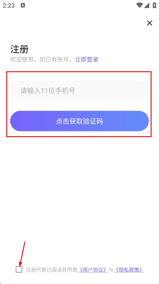 4、在注册页面,勾选同意协议,输入手机号,点击获取验证码完成注册。
