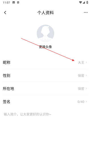 3、在个人资料界面里找到昵称选项,点击当前显示的昵称内容进入昵称编辑页面。