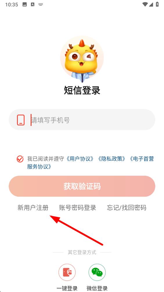 1、打开药九九app,进入短信登录界面点击新用户注册选项。