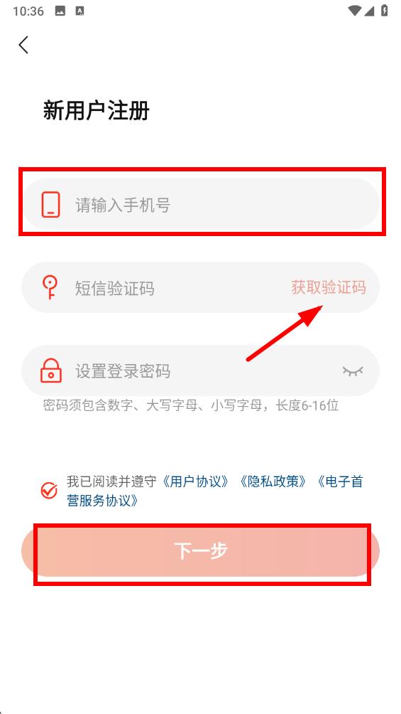 2、在新用户注册页面输入手机号获取验证码后填入,按照要求设置登录密码点击下一步。