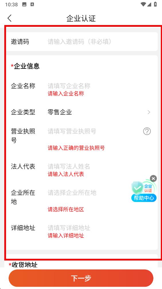 3、在企业认证页面,可选择填写邀请码,依次准确填写企业名称等信息,完成后点击下一步,完成注册流程。