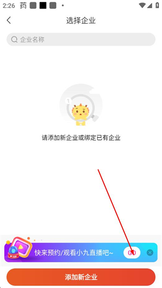 1、在药九九的选择企业页面,点击底部弹窗的GO,进入小九直播页面。