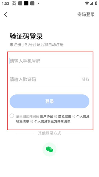 3、在验证码登录页面填写手机号码、获取并输入验证码,勾选协议后点击登录。