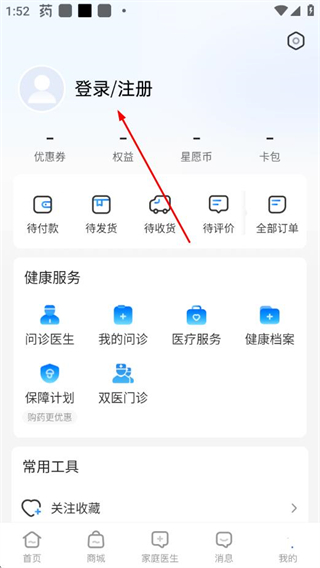 1、在复星健康app的首页,点击底部我的选项,进入个人中心页面。