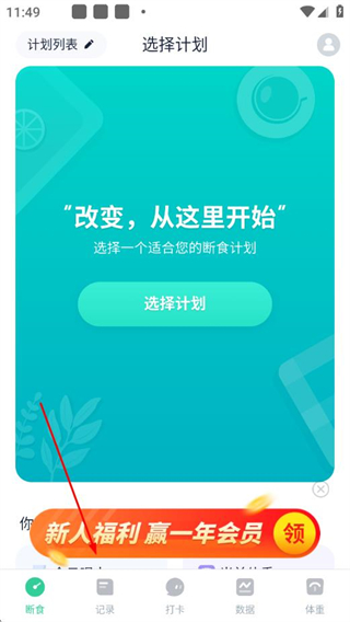 1、在辟谷轻断食app的选择计划页面,点击底部记录选项,进入记录页面。