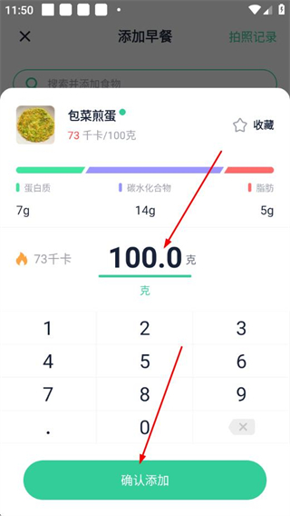 4、在分量设置页面输入食物重量后,点击确认添加,完成该食物的添加。
