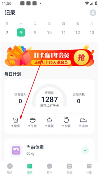 2、在记录页面的每日计划区域,点击+早餐选项,进入添加早餐页面。