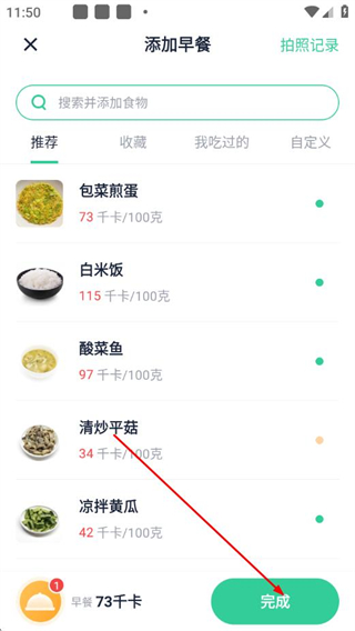 5、添加完所有早餐食物后,点击完成按钮,即可完成早餐食谱的记录。