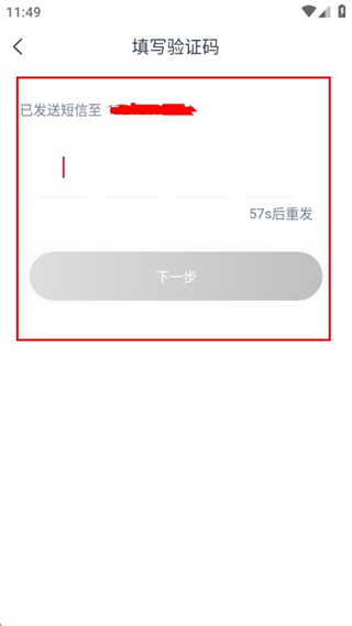5、在验证码填写页面,输入收到的验证码后点击下一步,完成注册流程。