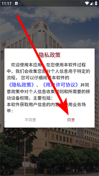 1、打开掌上中山一院,在隐私政策弹窗中,点击同意。
