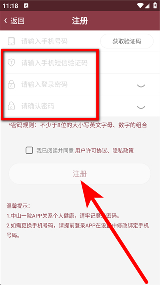 4、输入手机短信验证码、设置并确认登录密码,勾选协议后,点击注册,完成账号注册。