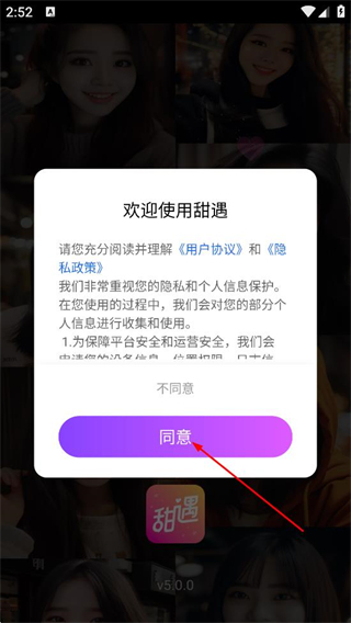 1、在欢迎使用甜遇弹窗中,阅读用户协议隐私政策后,点击同意。